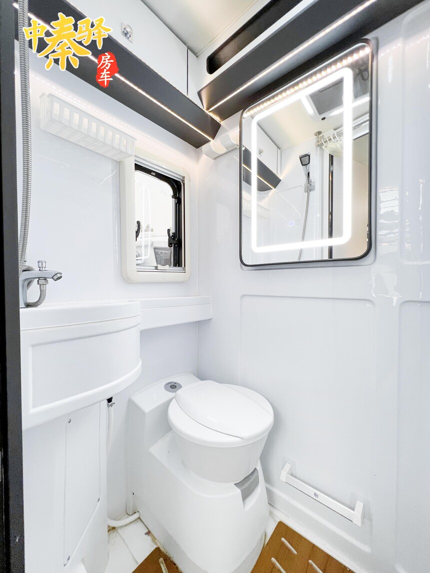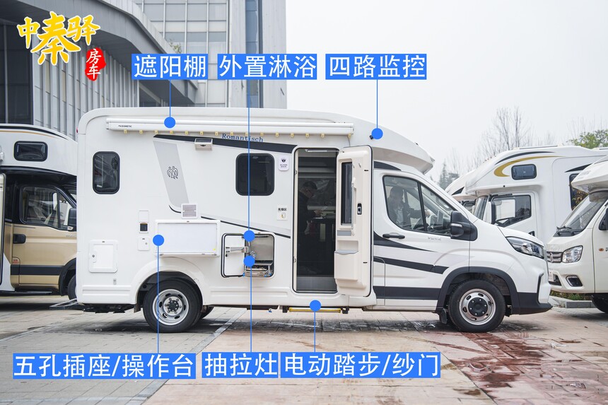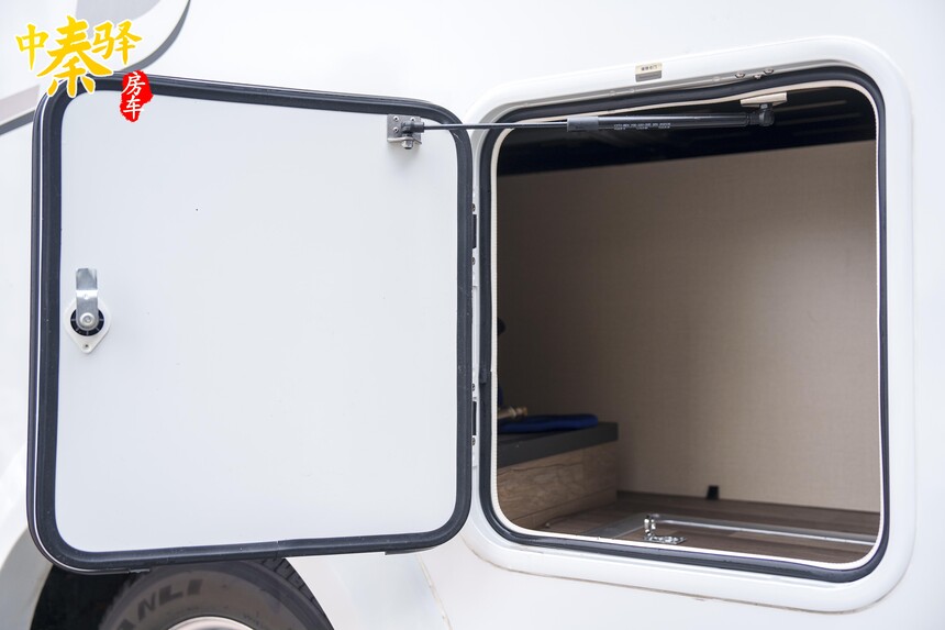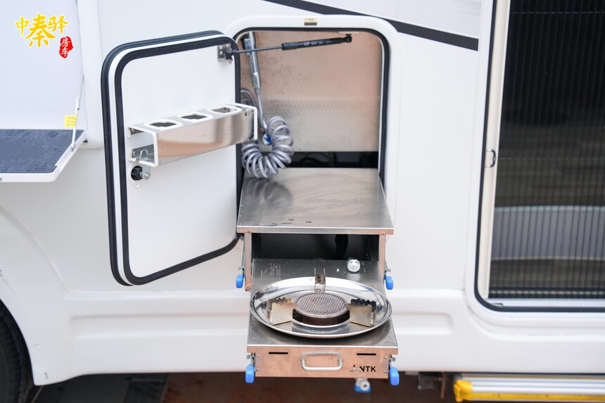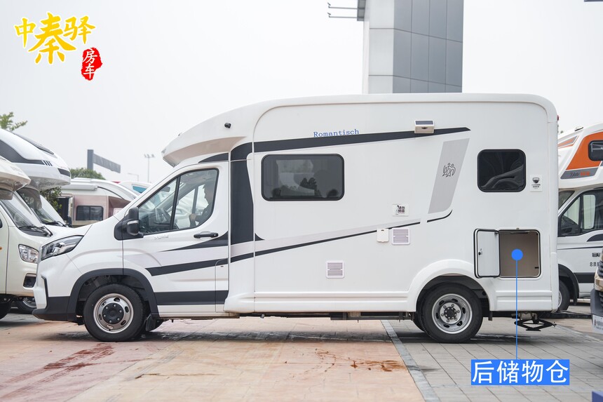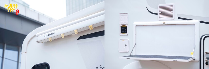车身左侧配有房车专用市电接口、贯通式储物舱。车身右侧配有黑水箱、户外插座、房车专用注水口、折叠桌板、户外灶/淋浴花洒。由于功能接口相对较少,侧面整体给人的印象简约而不失时尚。