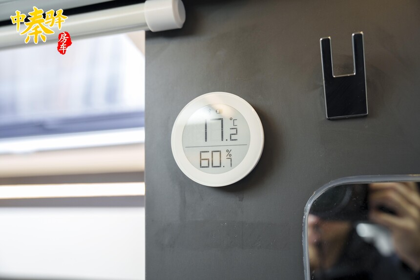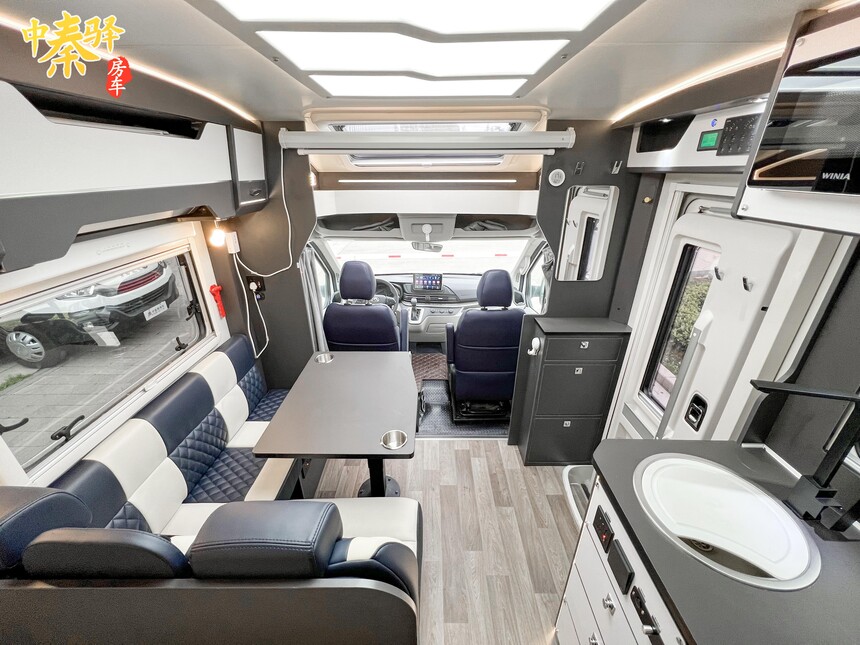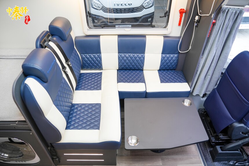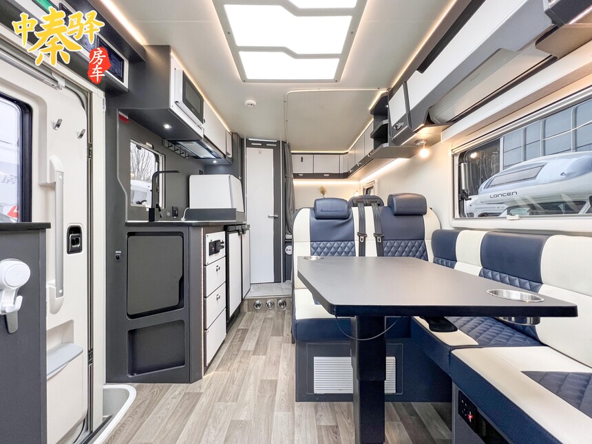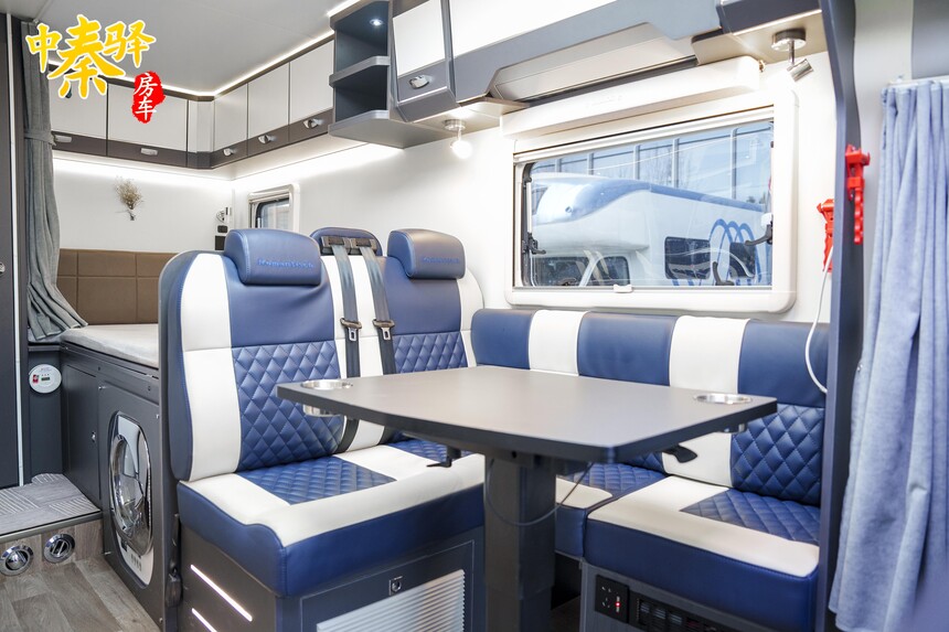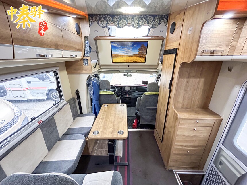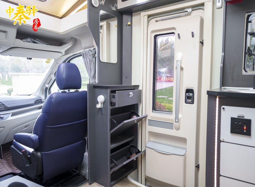 整车4座布局,会客区采用的是L型卡座沙发,搭配可升降桌板。沙发设计符合人体曲线,让乘客出行更加舒适。搭配中间的餐桌使用,可以在上面餐饮、会客。在驻车的时候,餐桌与沙发可以拼成一张床铺,增加房车内的睡卧区域,让每个乘客都有一个舒适的睡眠。座椅周围配置有五孔插座,方便乘客给电子产品充电。会客区的上方配置了一台格力家用智能空调,制热制冷效果更快,同时更加节能、静音;侧边配置了一扇推窗,保证了会客区的采光和通风效果,无聊的时候也可以欣赏一下沿途的风景,惬意美好。中门上车处有独立的鞋柜,这一点十分实用,避免鞋子乱放影响房车整体的美观。中门上方是控制面板,可以控制房车内的水电,采用物理按键,十分方便