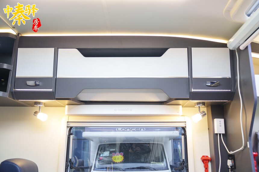 驾驶室的上方并没有设置额头床,取而代之的是一扇弧形的大尺寸天窗,整体看起来让房车内部更加通透、敞亮,也给房车内带来了充足的采光。额头处旁边设置有置物格,方便乘客放一些小物件。原车主在这一侧加装了一台电动投影幕布,随时随地可以来一场视觉盛宴。