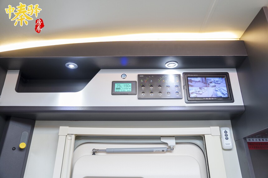 电控总成面板采用物理按键形式,易于操作,包含照明/氛围灯/户外灯/水泵/冰箱/娱乐等设备的开关,选用了48V200AH的锂电,600W太阳能板3000W逆变器。旁是四路监控显示屏,可以随时观察车辆周围的情况,保证车内人员的安全。