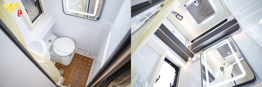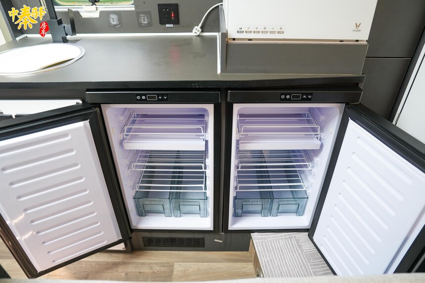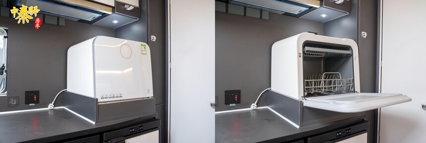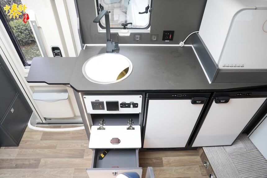 厨房区域面积很大,但还是配置有延伸桌板,进一步增大了厨房区的使用面积。操作台上有隐藏式洗手池,搭配旁边的五孔插座使用,做一顿简餐还是足够的。如果想做一顿丰富的午餐建议使用外面的厨房,更加安全,还可以避免油烟味进入房车内部,并且车主还选装了一台洗碗机,旅行烹饪也能解放你的双手。操作台的上方是一台微波炉,热热牛奶、饭菜都很方便;下方是一台152升的分体冰箱,有冷藏冷冻两个功效,为旅途储存更多食材,保护食材的新鲜。厨房区还有很多储物空间,锅碗瓢盆都能够收纳进去。