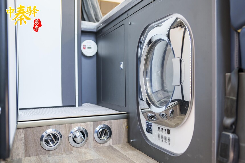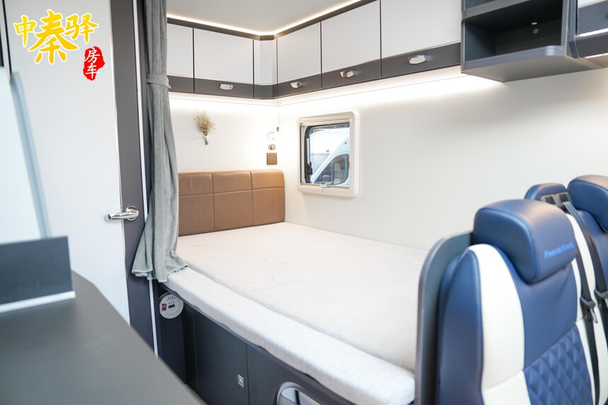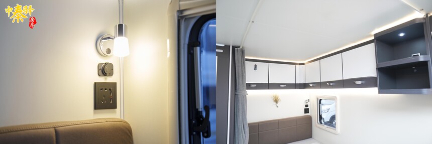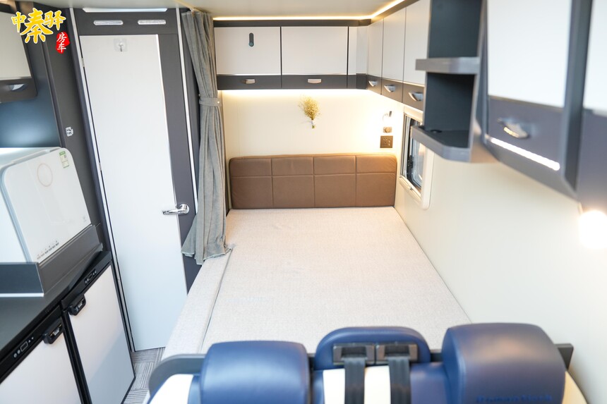 尾部睡卧区采用的是纵床设计,床铺尺寸为1950×1200mm,床铺上标配了舒适柔软的床垫,省去了后续的花销,晚上可以有一个舒适的睡眠环境。床铺的上方是一排储物柜,可以放置经常需要的衣物,柜子带有锁扣,不必担心东西掉落的情况发生;侧边有一扇小推窗,保证了休息区域的采光和通风。床铺的下方是一台洗衣机,旅途中解放双手,享受惬意的旅居时光。