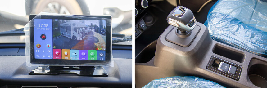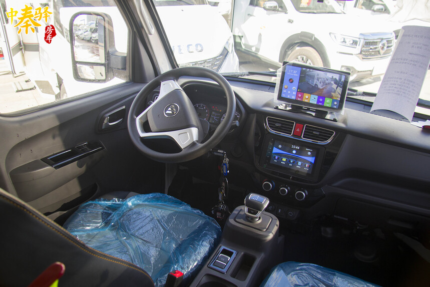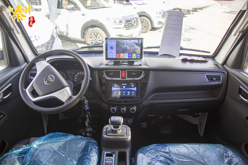 进入驾驶室,依旧是原厂的装修风格,主副驾座椅采用舒适设计风格,主副驾乘坐2人,全系配备电动门窗、中控锁、倒车影像、空调,并且标配ABS+EBD(制动力分配系统),保证车轮不被抱死,自动调整前后轮的制动力分配比例,防止侧滑和甩尾,最大力度的保证了行车安全。 此次底盘选用了自动挡变速箱,新手也能快速上手。仪表台上加装了个四路监控的显示器。