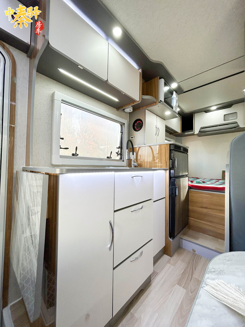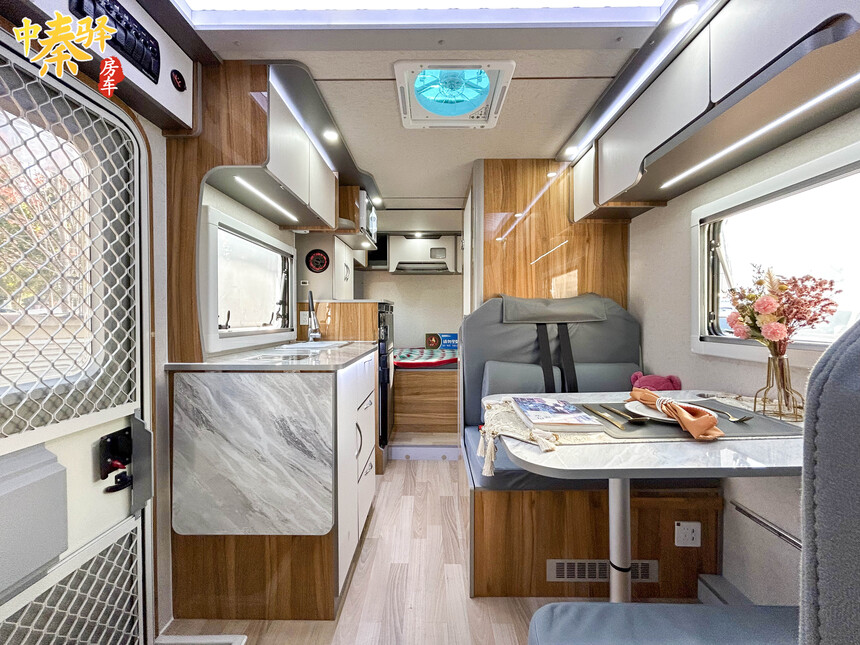 这款房车的尺寸为5830mm*2100mm*2680mm,长度远小于6米,前部采用小C型额头设计,灵活性和通过性要优于大多数C型房车,整车核载6人,蓝牌C照即可驾驶,低于2.7米的车身高度可以轻松应对城市、景区等各种限高路段。