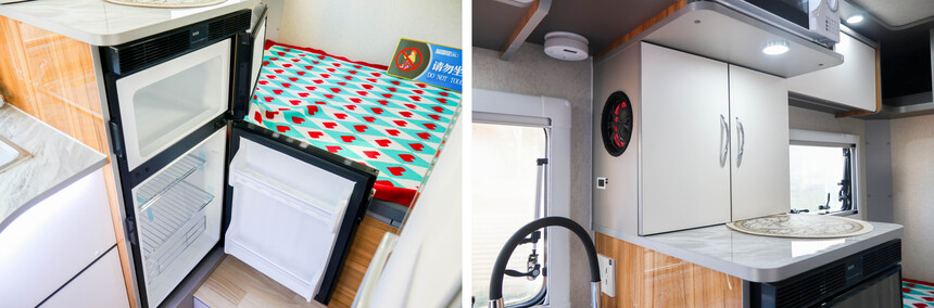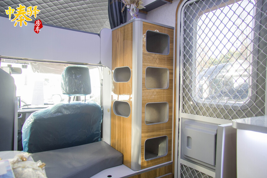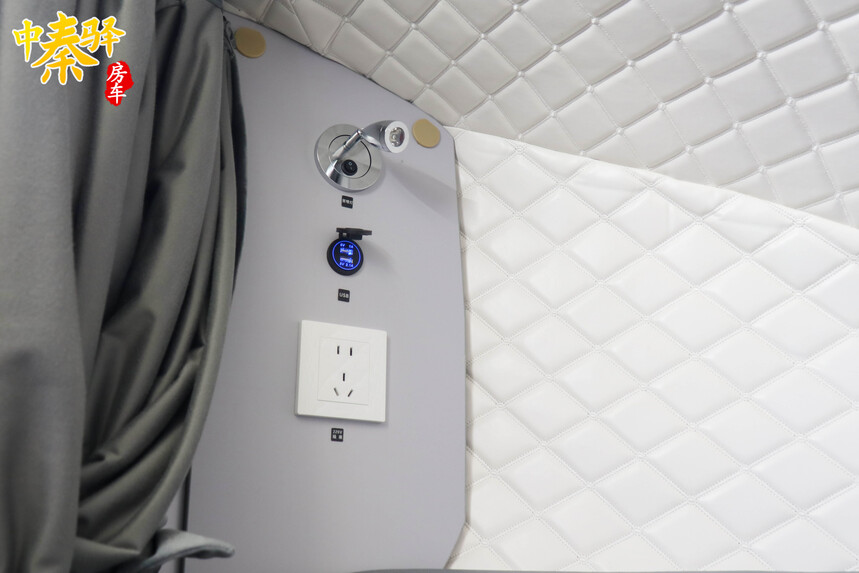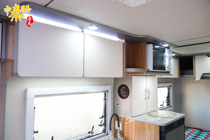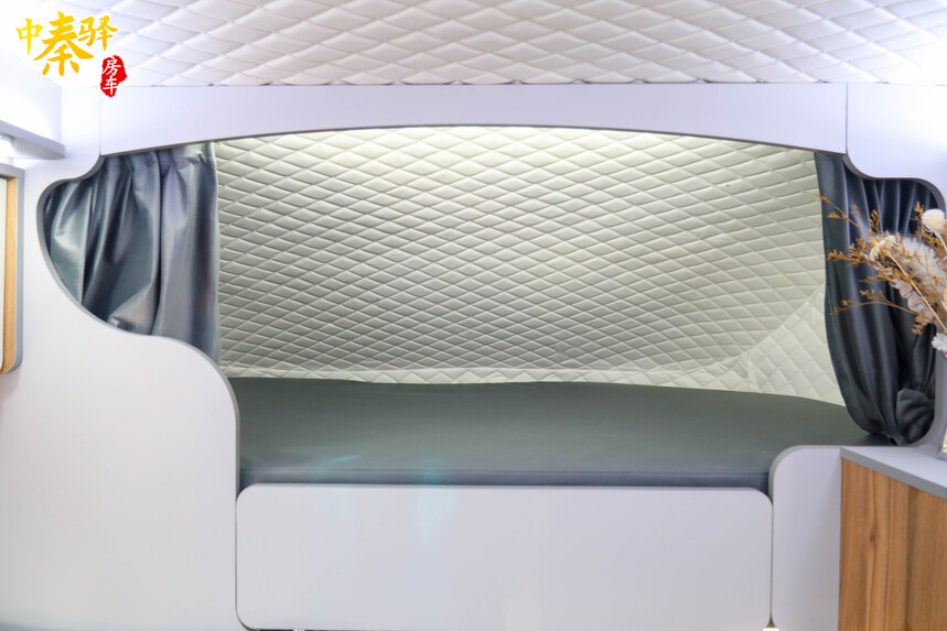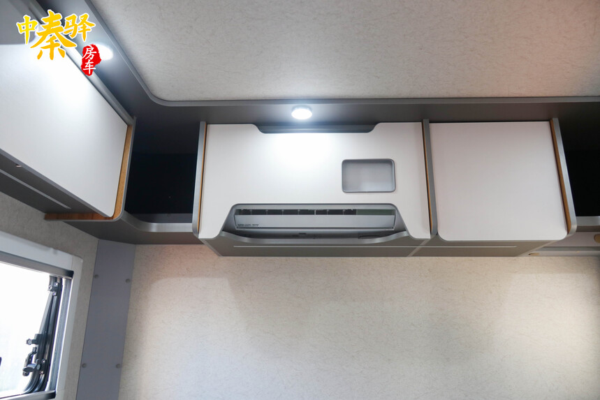 房车后方是一张后横床,尺寸为1900*1200mm,床垫非常舒适,可供1-2人休息。床的上方是海尔直流24V家用空调,临近空调两边设计有吊柜,并且床的两侧设计有窗户,对开窗户增加车内的采光及通透性。床的下方是贯通式的储物仓,尺寸与床的尺寸同等,为房车提供充足的储物空间。