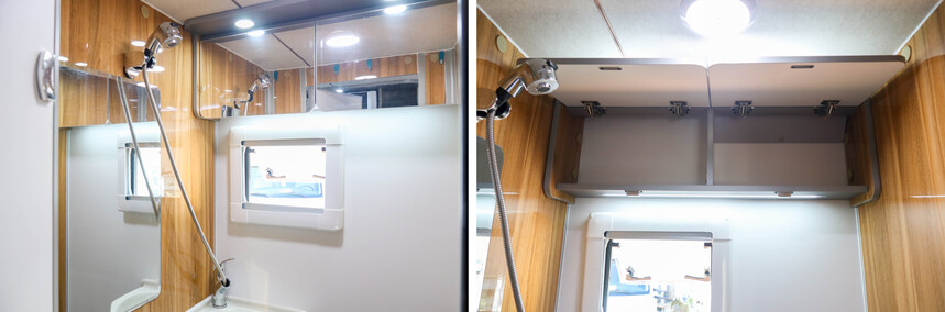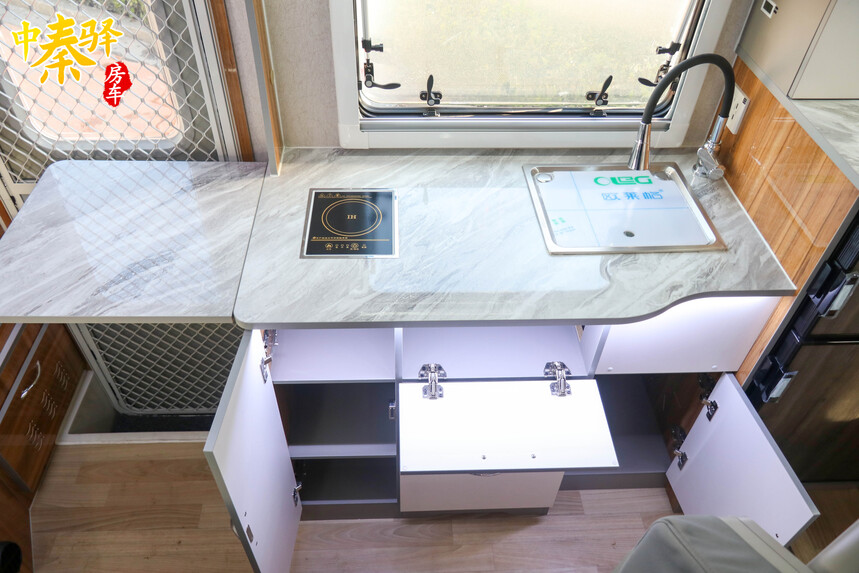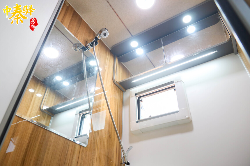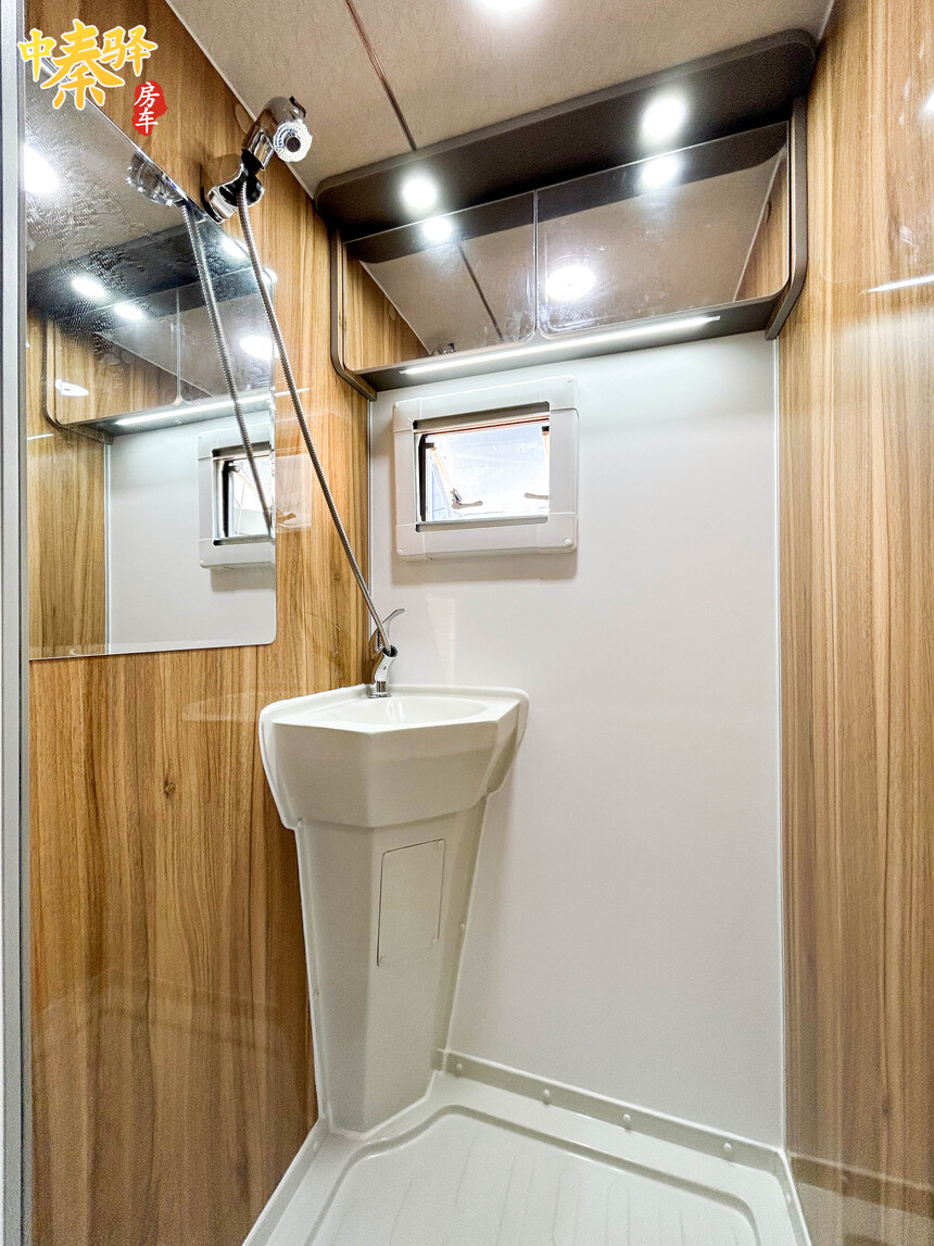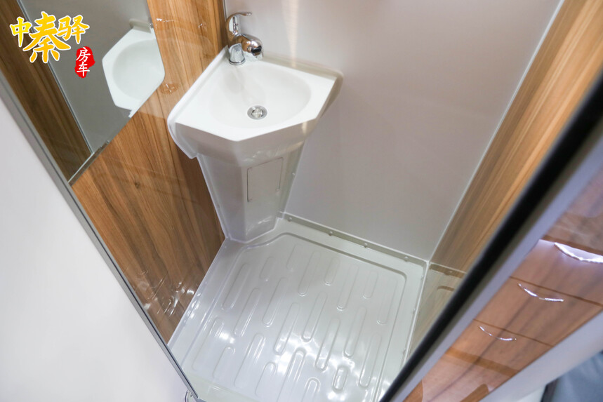 房车卡座后方是卫浴间,配有洗手盆和镜子,标配便携式马桶。假如在房车上有更高的如厕要求,也可选装抽拉盒马桶。此外还可选装3KG全自动洗衣机。清水箱的配置是200升,灰水箱是50升,可以满足日常的生活用水需求。