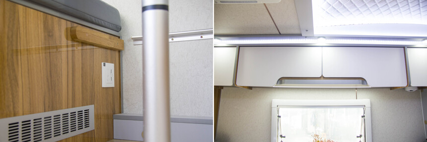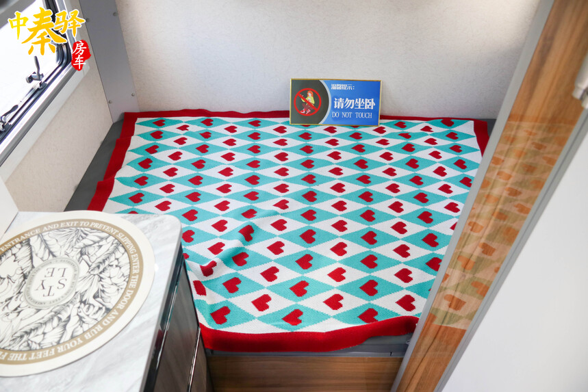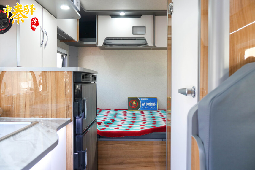 位于驾驶室上方的是前部额头床,尺寸是1900*1200mm,可睡1-2人,此外还可选装电视机,安装于额头床下方,为房车旅行带来更多的娱乐体验。