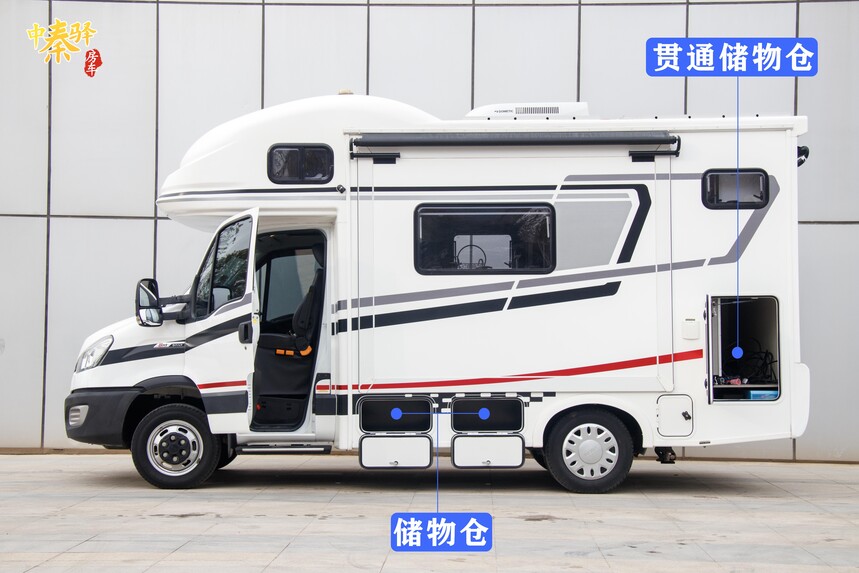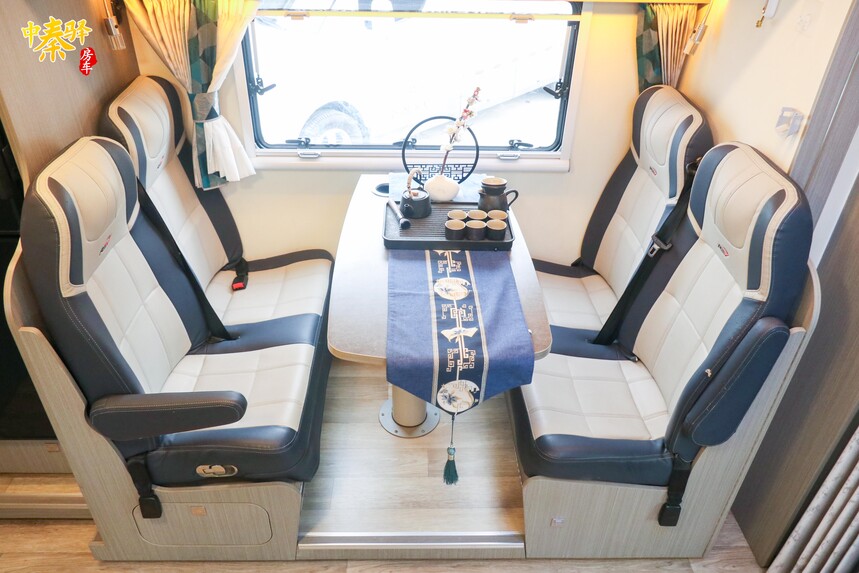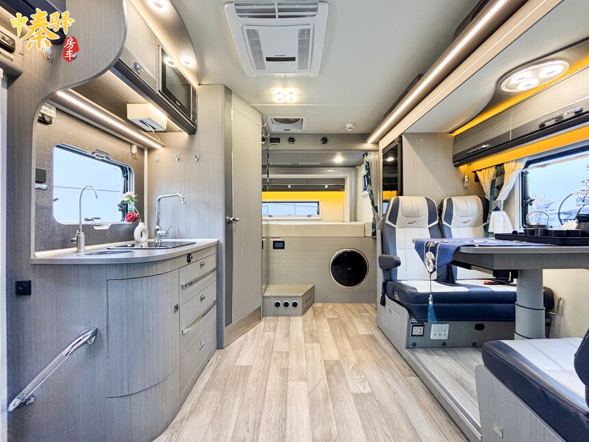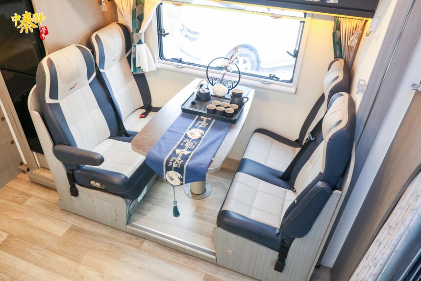 侧拓展展开后(2.45米*高1.9米*70公分)能拖出去73cm,增加有效面积1.7平米), 空间就增加了3.25立方。侧拓上部有三个吊柜,顶灯,阅读灯,氛围灯, 大面积风景区窗(60*115)房车专用侧推窗,多向多级可调节进口升降餐桌,落下可以变成一个儿童床,对坐人体工程力学乘用车卡座沙发,可调节,带扶手。卡座下部是通长的储物空间,可以放一些大的和长的物品,卡座下部还有储物抽屉和储物柜。