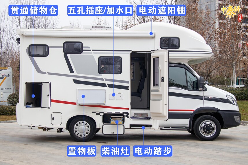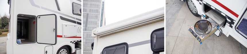 车身材质和骨架结构采用高强度的铝合金结构和铝板车身,三明治保温箱体。另外一个独一无二是车顶结构,一体成型复合材料,“屋脊”双坡顶造型,厚度达12厘米。这样保温就做到了最好,而且利于排水。车高3.2米,顶部标配有570W的太阳能板,侧方配有电动风感遮阳棚,刮风下雨忘记收遮阳棚了,遇到恶劣天气,它会自动收回。两侧还自带两条户外灯带,解决了照明问题,外部配有四路监控系统以及户外D-MAX抽拉式煤气灶具,五孔插座,外置水路快接口等,满足日常生活的使用。