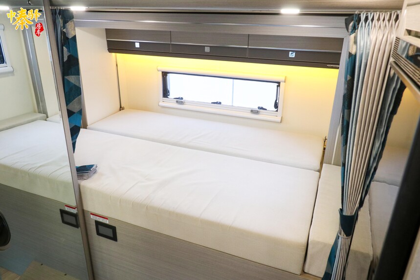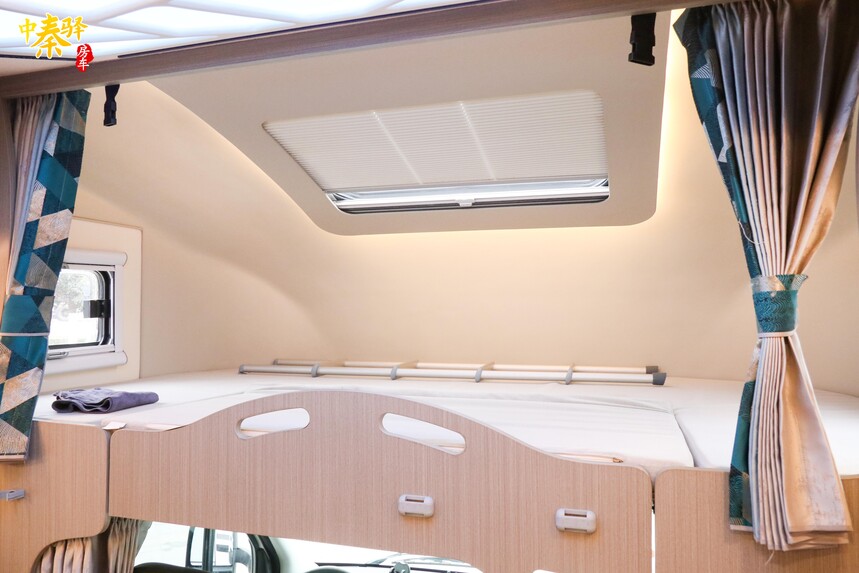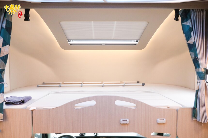 额头床上方 大面积弧面透明透气窗(60*90),可以晚上一个人静静的躺着看星空,两侧小通风窗 。一张双人大床铺(1.4*2.2米,最大高度75公分),高密度泡面床垫(6公分),配有安全网和隐私帘。额头翻起是40寸小米智能网络电视,这在房车配置里也算是大屏幕了。