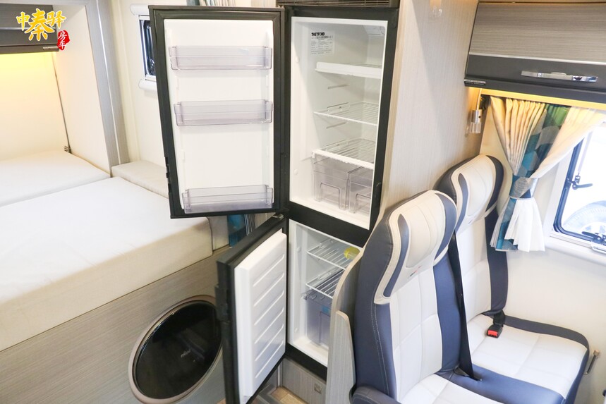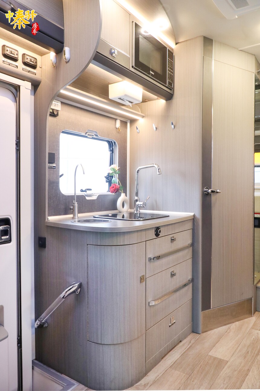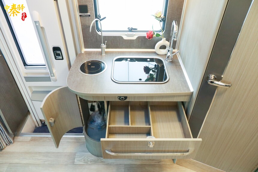 厨房操作区域,顶部设有吊柜,侧壁通气窗户(40*60),侧面有伟巴斯通燃油暖风热水器的控制器,还有大功率220的插座,插一些厨房家电。操作台面上是车用电磁炉,房车专用水盆,下部是暖风风量调节旋钮。在下是抽屉,一和格兰仕微波炉。最底部打开可检修和控制水路。侧拓展的后面是142L房车超大双开门进口房车专用冰箱,路上的一切美食都可以保存。