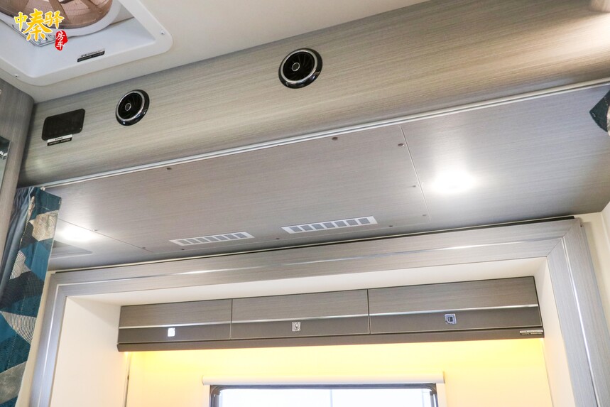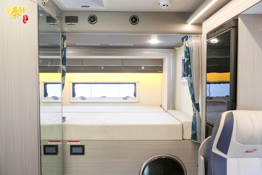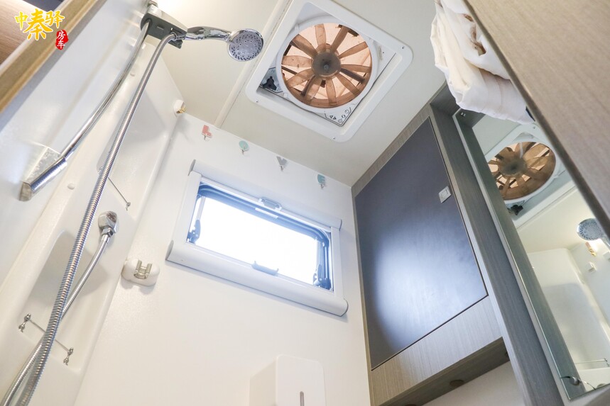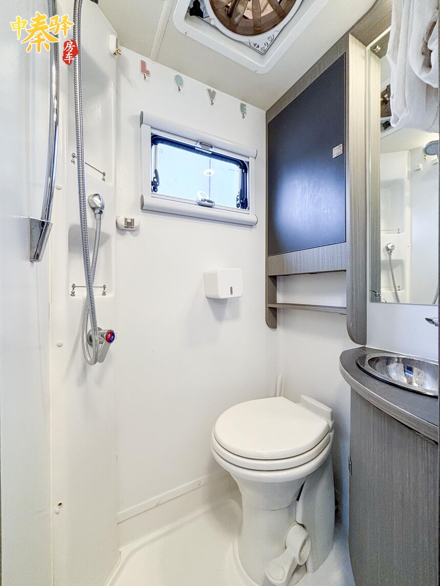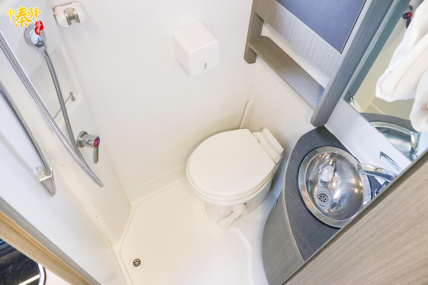 卫生间的空间比较大(80*100公分),整体复合式防漏水卫生间,进口多美达水封电动粉碎式直排马桶,黑水箱50升,非常奢华的卫生间壁柜和洗浴台置物空间,顶部通气扇,侧窗,还有浴帘,下部还有置物柜,这是一个公寓标准的卫生间。小空间大功能,细节设计和空间使用都非常的到位。这辆车配备了205升净水箱,50升灰水箱和50升黑水箱。