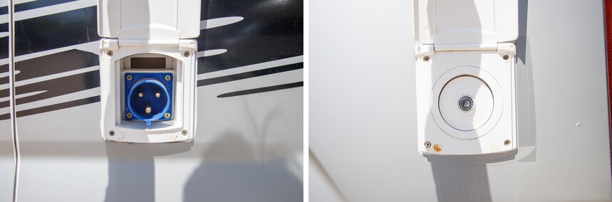 车侧设施丰富,配备有手动遮阳棚、注水口、充电口、储物仓等。