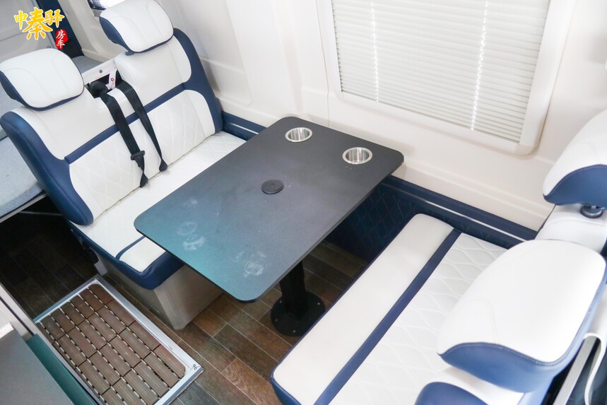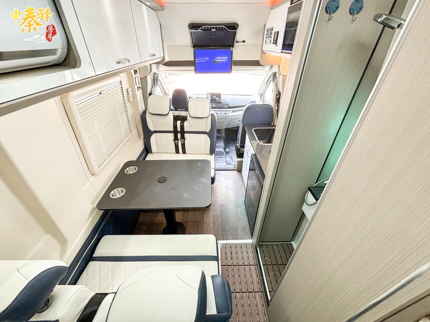 会客区采用双人对坐式卡座设计,中间配备升降桌,方便车友在此娱乐、用餐或办公。夜晚时此处区域沙发可以可升降座进行组装,变成一张临时的单人休息区域。会客区上方设有空调和储物吊柜。前方是吸顶电视