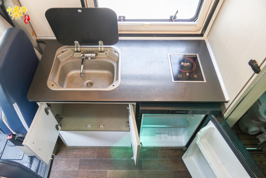 厨房区位于会客区对面,无中门的设计让台面非常大,配备有洗菜池电磁炉,方便清洗菜品,另外在台面下方设置储物柜,方便车友置放厨房调料或其他所需物品。还有一台房车专用冰箱,可以用来冷藏或冷冻食物。顶部则是控制面板和微波炉。水电系统方面,本车配备有110L清水箱、60L污水箱、3000W逆变器、48V 5度锂电等。