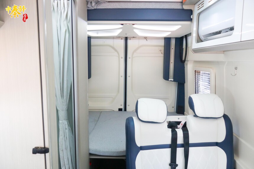 尾部休息区采用横置床设计,床铺两侧均配备有窗户,为内部带来通风和采光。顶部特别装置了电动升降床,这样在有限的B型空间内总共赋予了三床的休息空间。床铺下方特别采用镂空设计,留有更多行李的收纳储存空间。