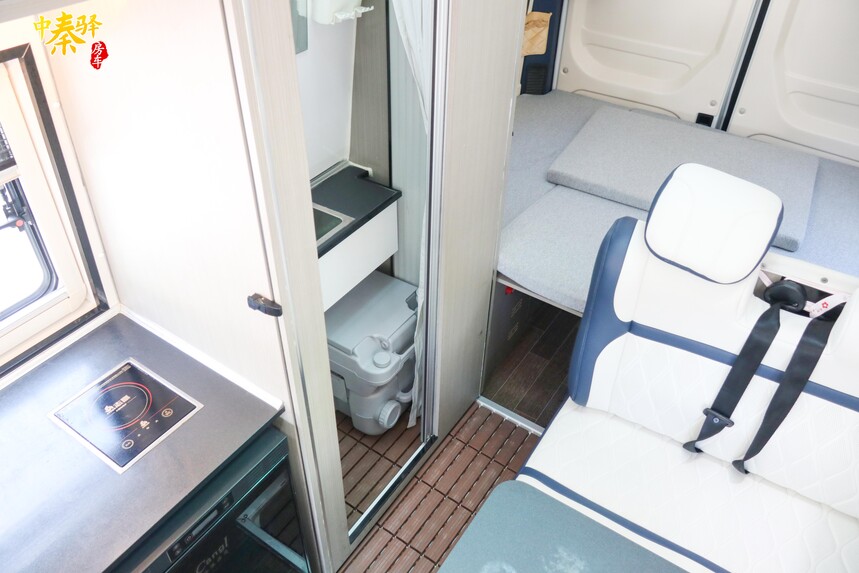 卫生间采用可抽拉式设计,需要使用时抽出即可,不需要使用时也可以节省内部的生活移动空间。内部设施齐全,配备有梳妆镜、抽拉式水龙头、便携式房车专用马桶等,带来便捷的淋浴洗漱空间。