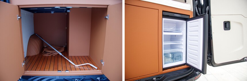 对开式后尾门可实现向两边开启,打开后就是后置横床,床下为储物仓和另一台冰箱,放在这里我们在户外做饭非常方便拿取