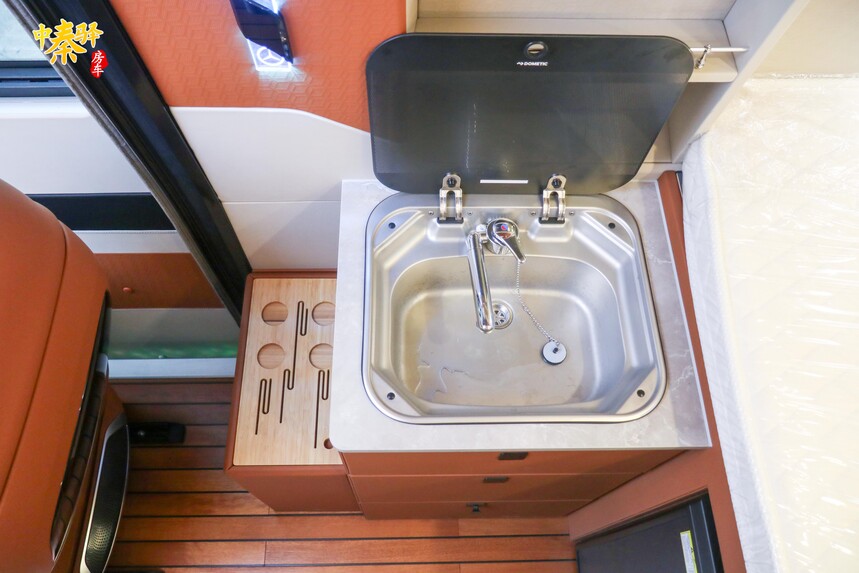 厨房区配备304不锈钢带盖洗菜池,水龙头可根据使用需求上下调高度,侧方上下厨具专用储物柜,锅具厨具等物品方便储放。49L进口冰箱,确保您的食材随吃随拿随新鲜。