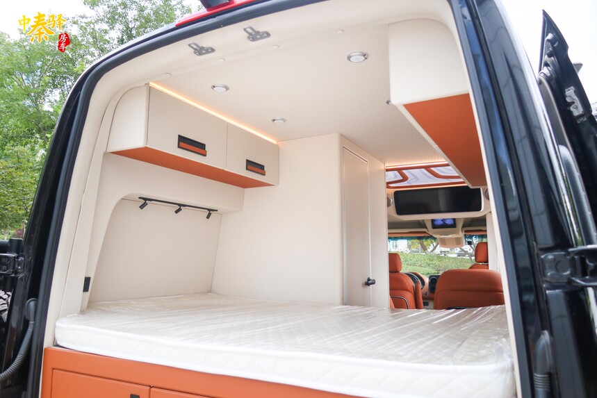 车内采用2+2的四人B型房车布局,凶猛无比的外表下隐藏着精致大气的内饰,整车采用爱马仕橙色纳帕皮包覆,明黄线条点缀,彰显尊贵的同时又不失简约。既能满足偶尔的商务洽谈,也能做到一家人周末的郊游所需的功能覆盖。偶尔还能越越野