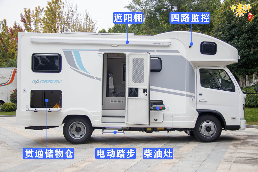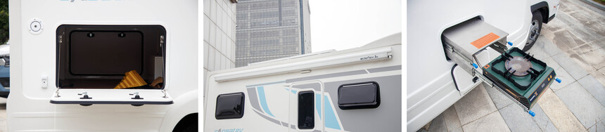 车身上配备的多项实用设施也令人眼前一亮:大号贯通储物仓能够轻松容纳大件行李;360°全景监控系统实时保障行车安全;户外抽拉柴油灶;手动遮阳棚,满足了户外生活的各种需求。