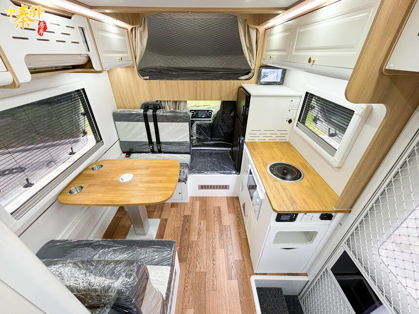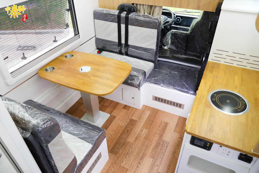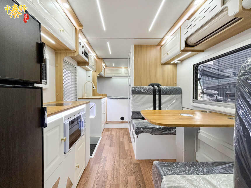 步入车厢,你会立刻被其宽敞明亮的内部空间所吸引。轻卡底盘的优势在此展现无遗,即使不打开拓展舱,车内也不显局促。内饰设计采用温馨的居家风格,浅色家具搭配原木色门板和饰条,勾勒出清爽的视觉感受。