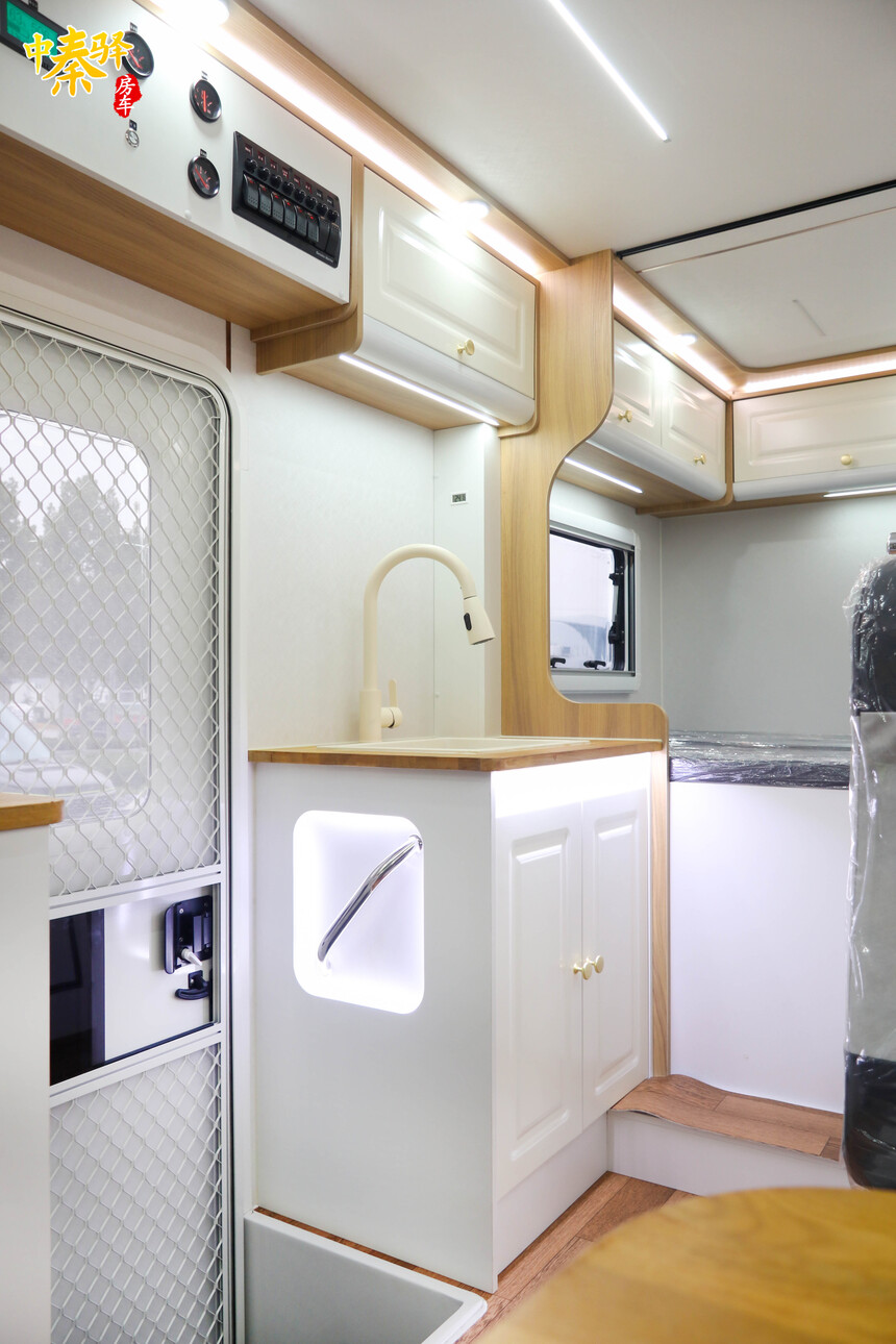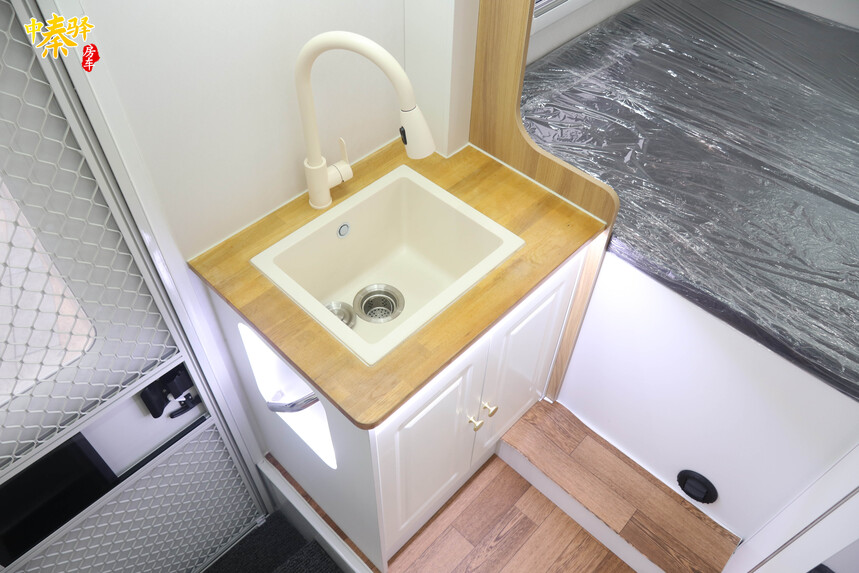 中门另一半则是独立的洗菜水盆,平时也能当作干湿分离的洗脸台盆,上面设置有整车的控制区域,方便操作。整车配备了800AH磷酸铁锂电池(12V),智能逆变器3000W(12V),720W太阳能板。水路则配备了200L清水箱,100L灰水箱。